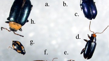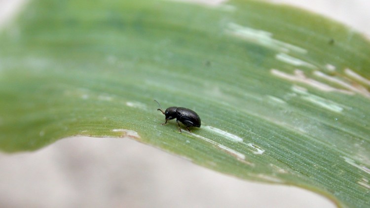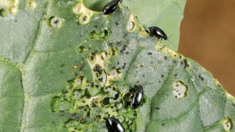Зелено-чёрные с металлическим отливом прыгающие жуки размером с булавочную головку проедают маленькие отверстия в семядолях и первых настоящих листьях рассады сахарной свеклы, особенно на растениях вдоль насыпи траншей и заборов, где эти насекомые зимуют. Наиболее серьезный ущерб они наносят, когда аномально прохладная весна замедляет рост сахарной свеклы.